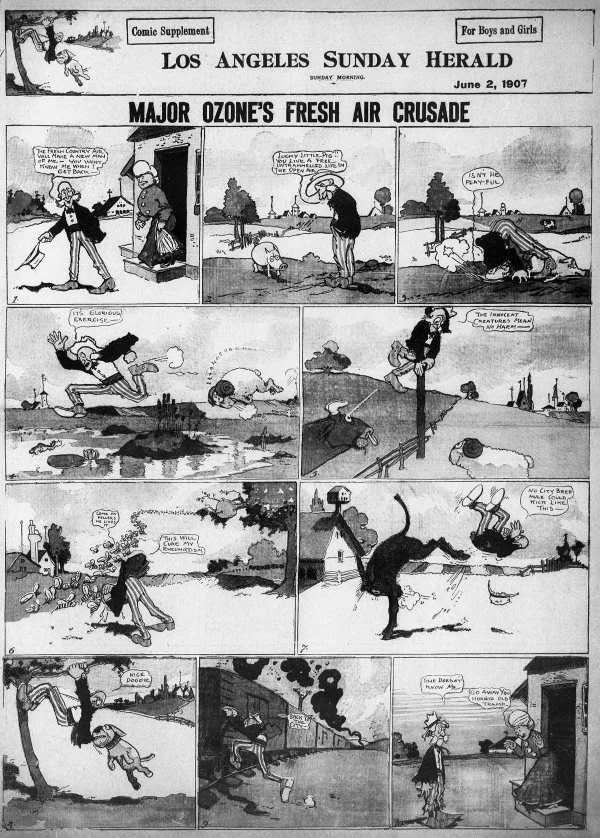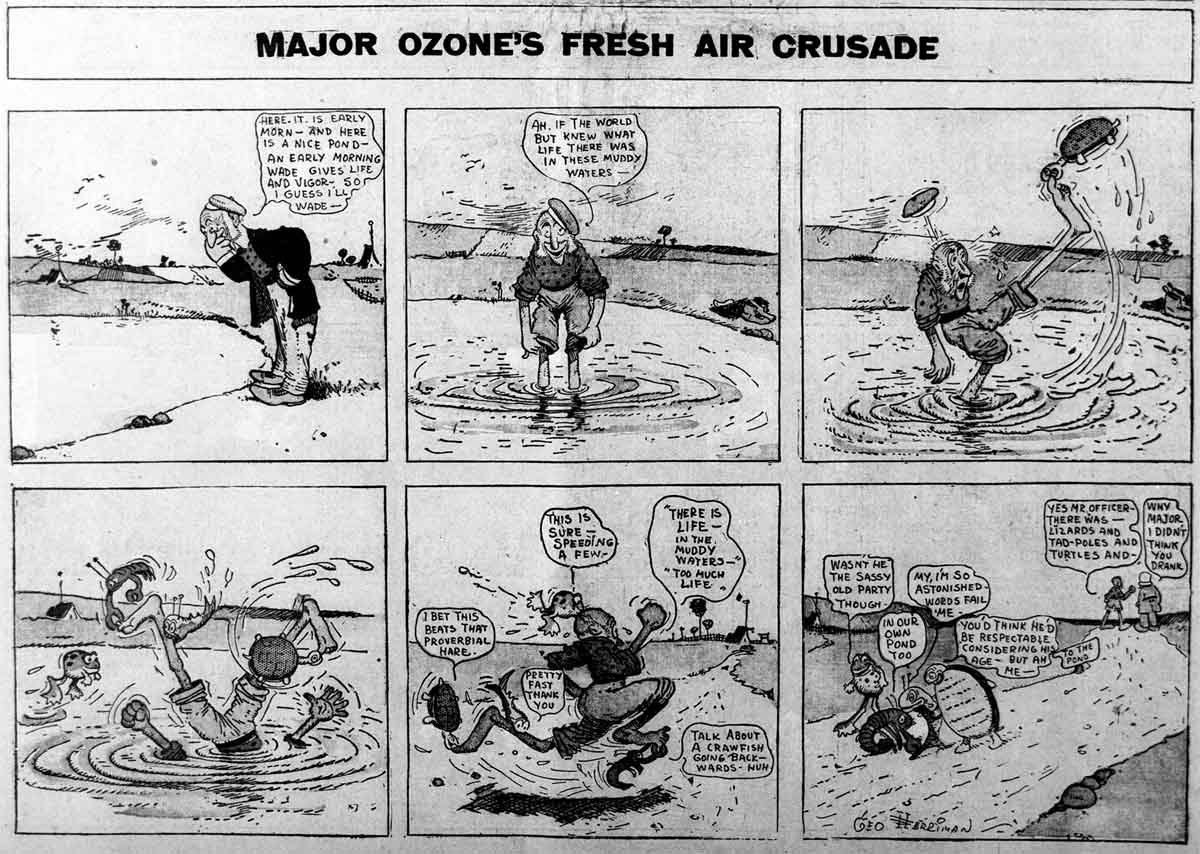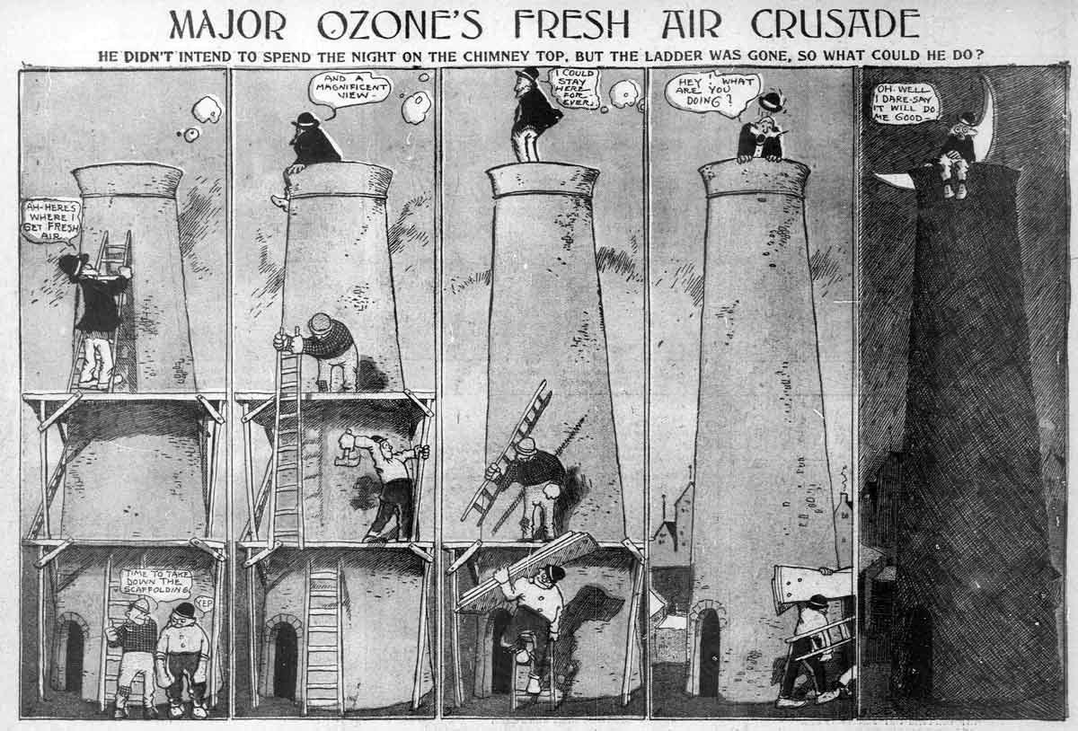 Allow me to introduce a lesser know creation of George Herriman, Major Ozone's Fresh Air Crusade. Major Ozone is a man obsessed with fresh air. He talks about it. He reads whatever he can about it. He's been known to risk his very life for it. And as you may have guessed, all it ever brings him is trouble. There are some neat strips, such as this one where the Major climbs a smokestack only to find himself stuck for the night. And speaking of smokestacks, how about those kids in this strip?
