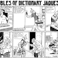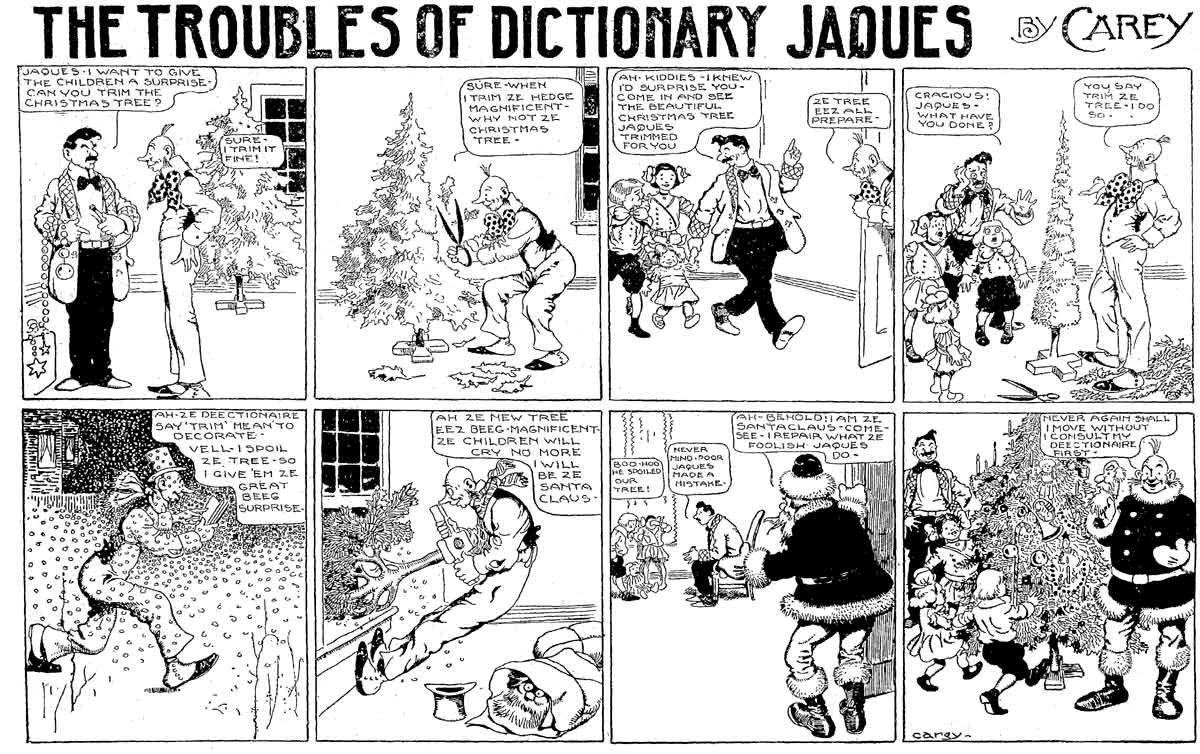 It is with great excitement that I add Ed Carey's The Troubles of Dictionary Jaques to the archive; we have been looking for this one for years. Back when we first started this site, Holmes and I were discussing strips we had never seen but really wanted to find and share here. For my part, I was dying to get my hands on Madge the Magician's Daughter, which I thankfully found a while back. Holmes mentioned our new friend Dictionary Jaques, and I was intrigued right away. Ron Goulart's The Funnies showed a couple panels, but that was as close as I've come to seeing the strip until I recently stumbled upon it while looking for something else. So in celebration of my pal's birthday, I'm posting all the Jaques I've been able to find. You may remember Carey's work from another favorite of ours (and, coincidentally, another strip discussed that fateful day): Dolby's Double. Jaques is a really fun creation. The situation is simple enough: Jaques is a Frenchman who relies on his dictionary to understand his surroundings, but misinterprets the definitions he reads. Hilarity ensues and you get some crazy imagery like Jaques head-butting a stranger who resembles Everett True or Jaques bundling up a baby like a package.